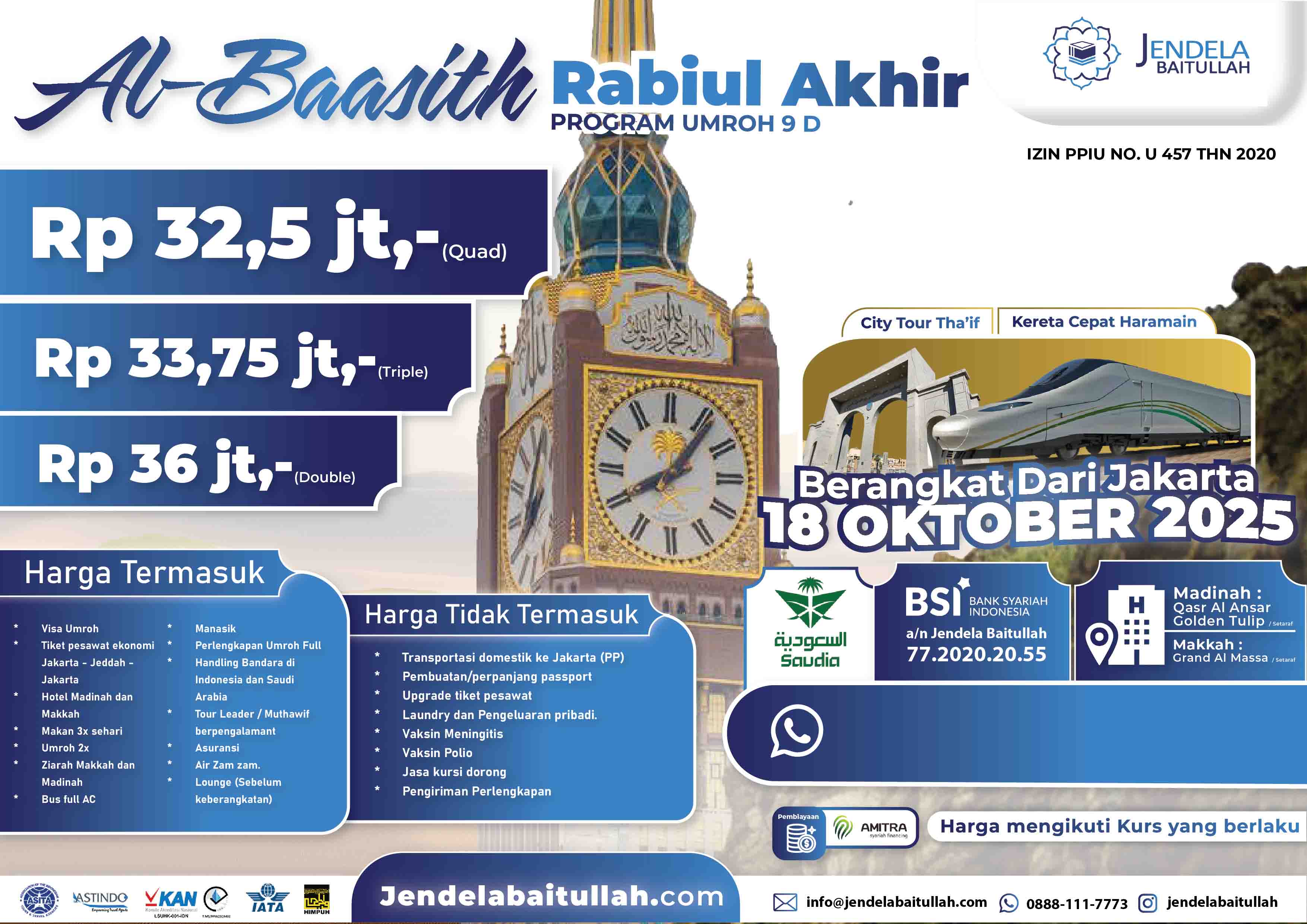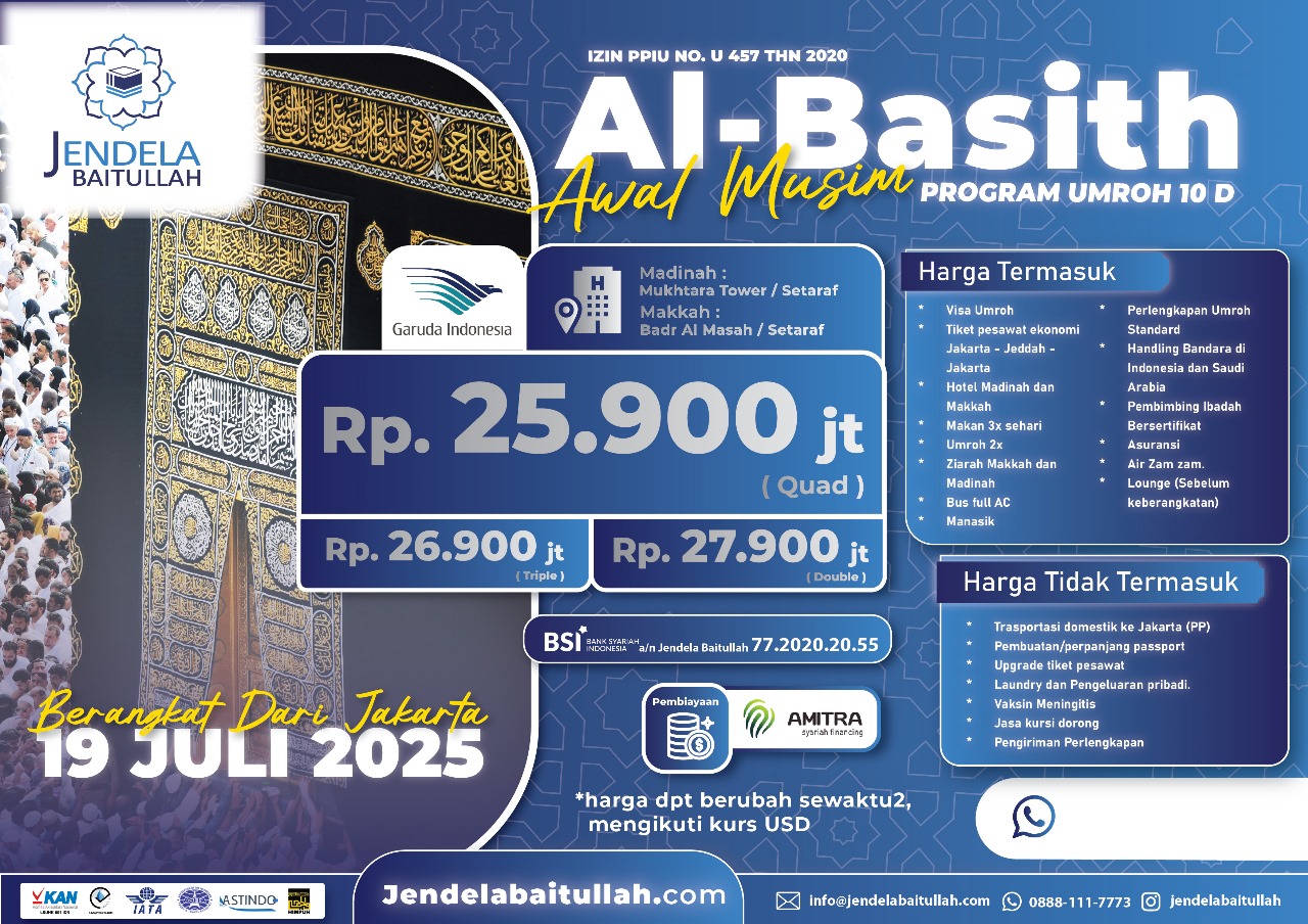 Umroh Maulid 30 Agustus 2025 | Mulai dari Rp. 26 jt - by Lion Air Paket Umrah 9 HariUmroh Rabiul Akhir 25 September 2025 | Mulai dari Rp. 26,9 jt - by Qatar