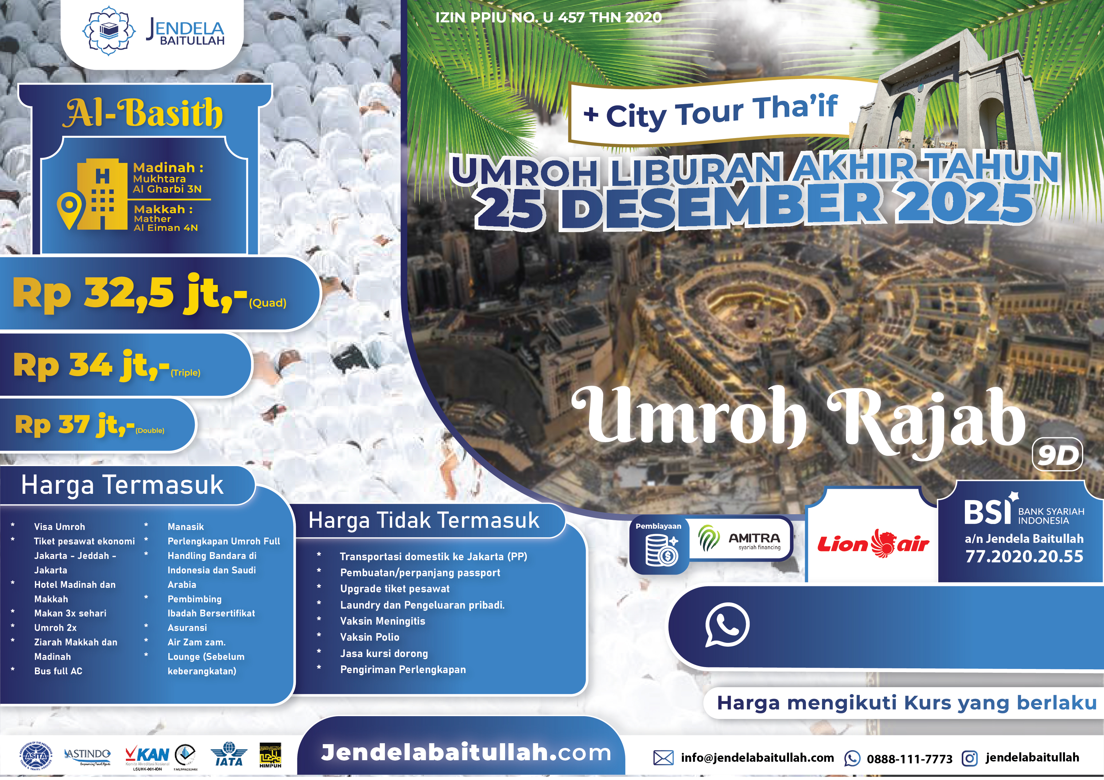 Umroh Maulid 30 Agustus 2025 | Mulai dari Rp. 26 jt - by Lion Air Paket Umrah 9 HariUmroh Rabiul Akhir 25 September 2025 | Mulai dari Rp. 26,9 jt - by Qatar